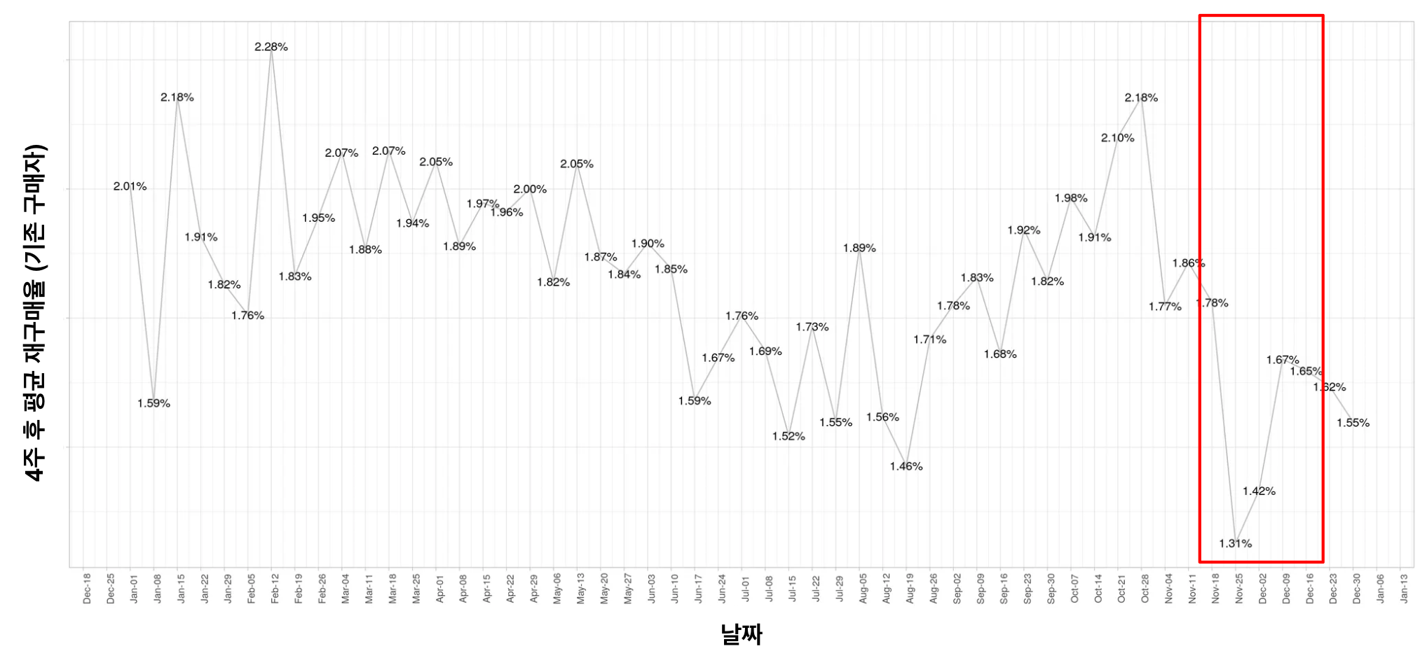 블랙프라이데이 기간 동안 전체 재구매율은 약 2.4~3.1%로, 연평균 대비 다소 낮은 수준이었습니다 [그림4]. 기존 구매자 역시 동일한 흐름을 보이며, 초반에는 약 1.3%까지 하락했다가 12월 중순에 소폭 회복하는 양상이 나타났습니다 [그림 5].