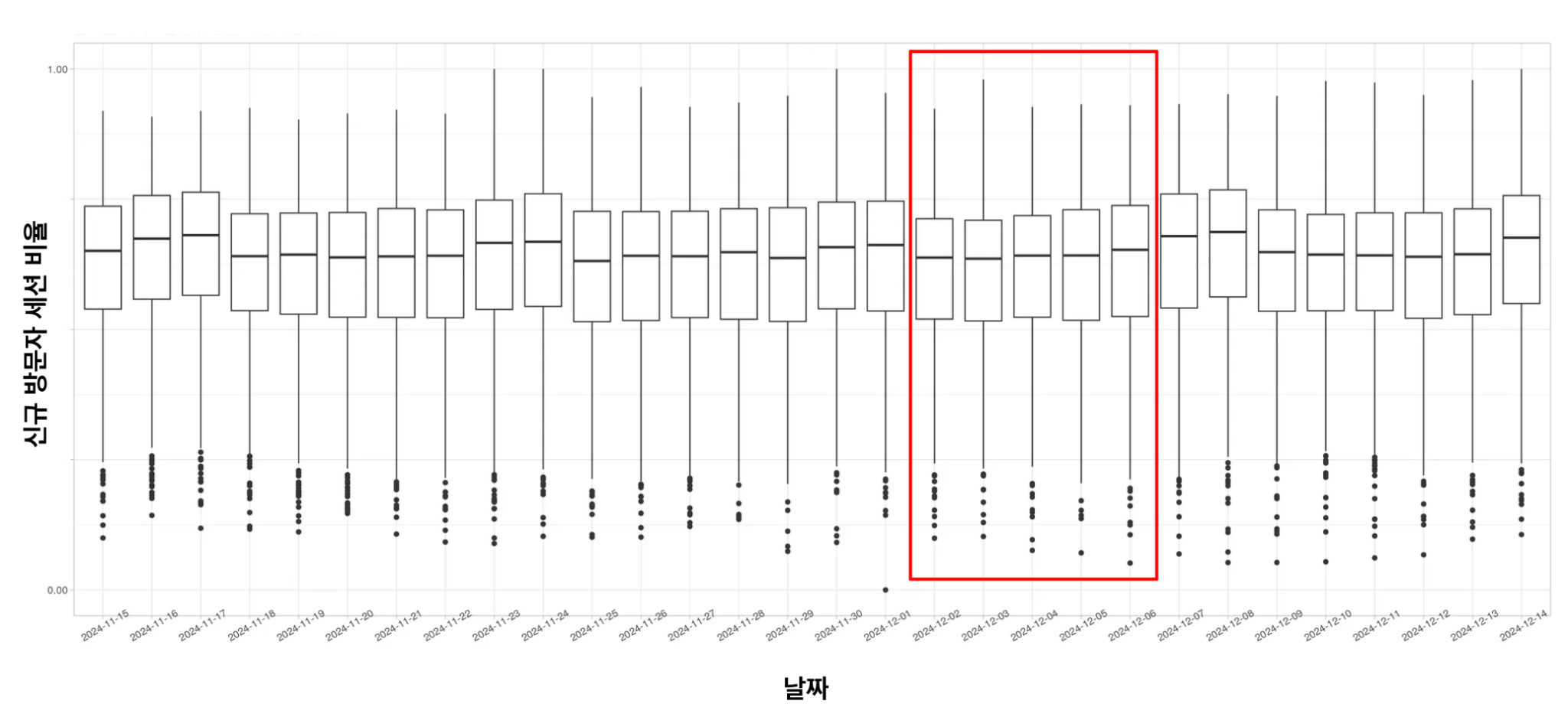 블랙프라이데이 시즌이 끝난 이후 신규 방문자의 비중은 감소했지만 [그림 2], 전체 전환율은 시즌 내내 안정적으로 유지되었습니다 [그림 3]. 겉보기에는 신규 방문자가 초반 매출을 견인하고, 기존 고객이 이후 모멘텀을 유지한 듯 보입니다.