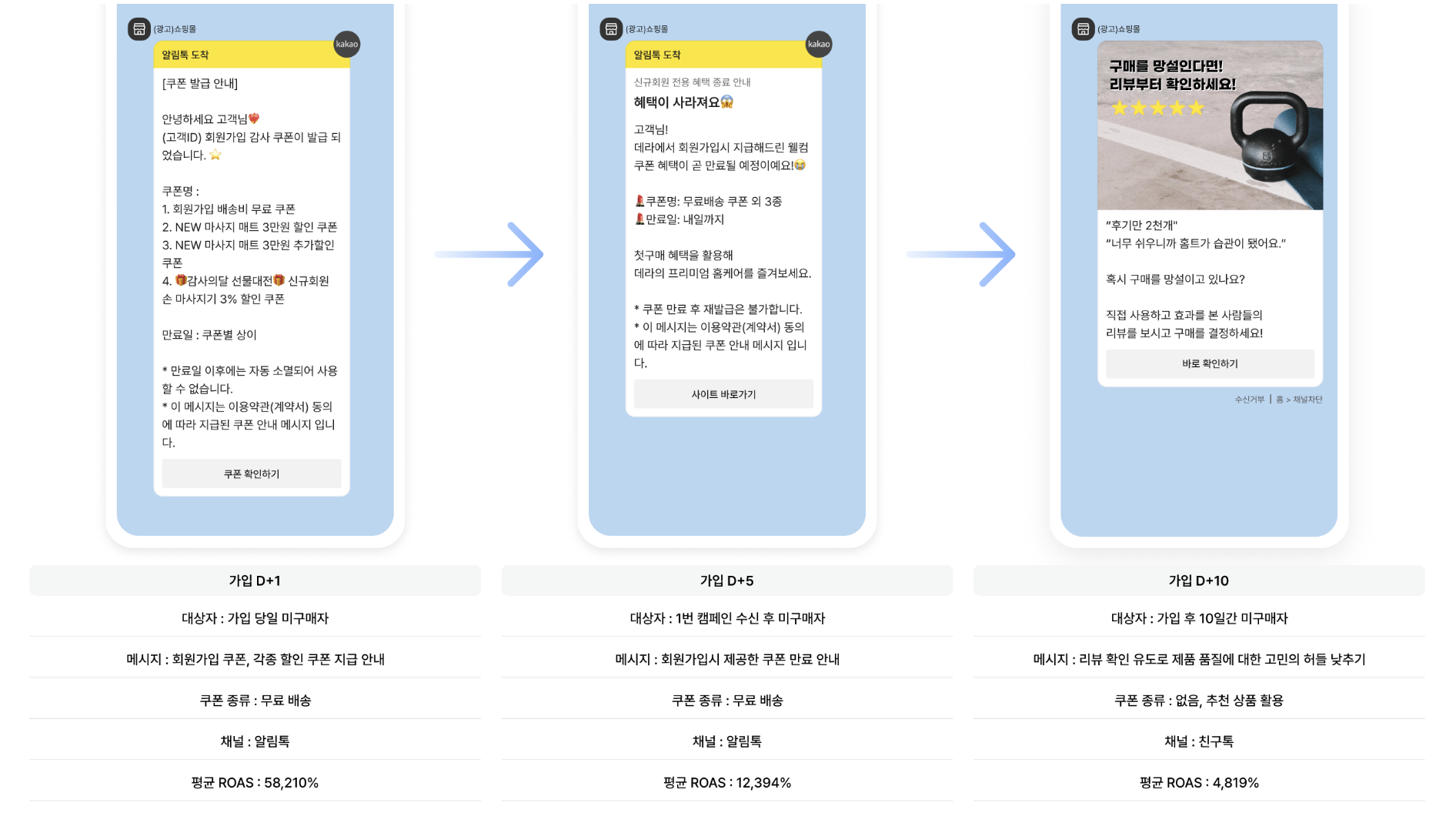 - 구매 직후 웰컴 메시지 발송 : 친구톡으로 구매 감사 메시지 + 혜택 정보 제공