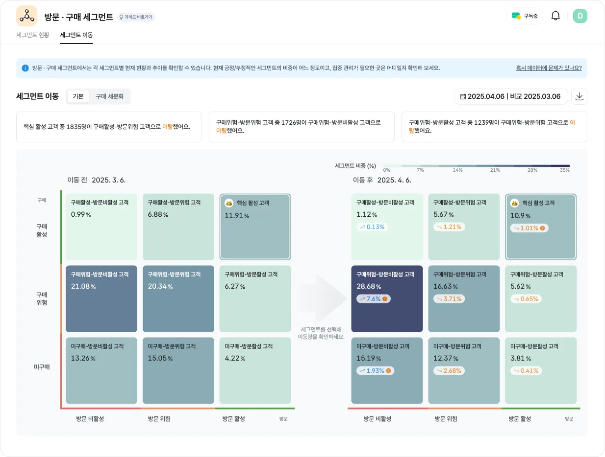 먼저 현황 탭에서 세부 세그먼트를 선택하면, 해당 세그먼트로 이동한 상위 3개 세그먼트를 확인할 수 있습니다. 선택한 기간 동안 변화가 없는 고객을 제외하고, 어떤 세그먼트로 이동이 많았는지 쉽게 파악할 수 있습니다.
