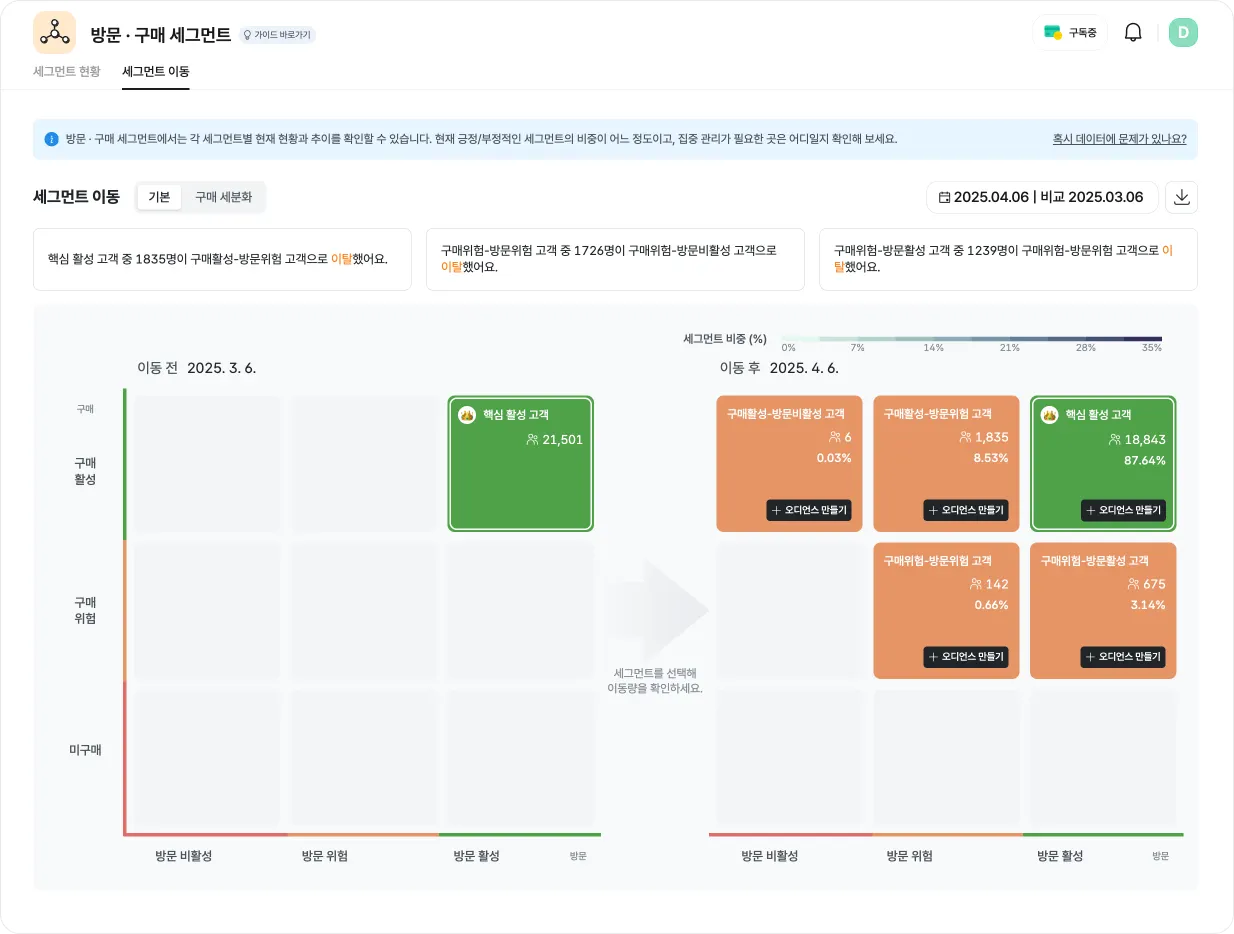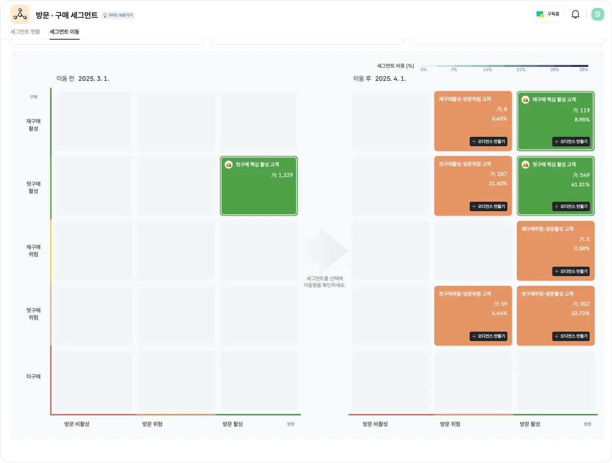 이를 통해 ‘구매위험-방문위험’ 세그먼트에 있던 고객들이 방문이 줄어들며 ‘방문비활성’으로 전환된 흐름을 쉽게 확인할 수 있고, 마지막으로 이동 전/후의 세그먼트를 클릭하면 각각 이동한 고객들에 대해서 캠페인을 집행할 수 있도록 오디언스 생성이 가능합니다.